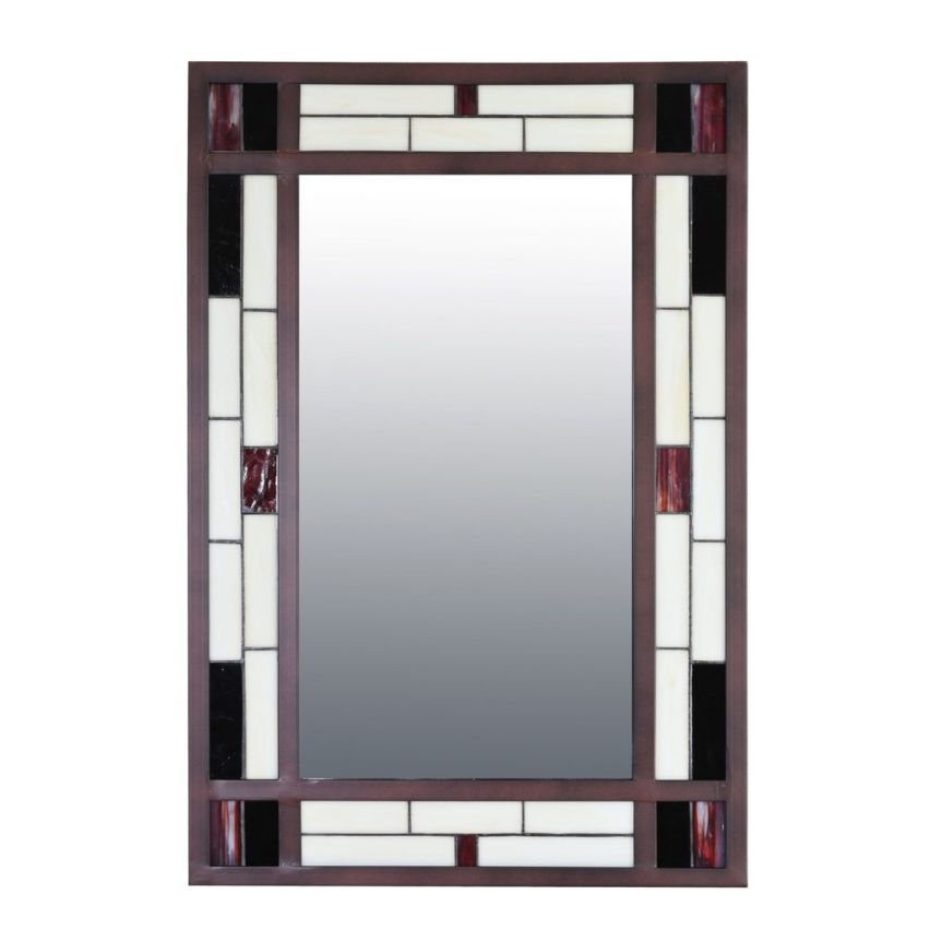 Indrukwekkende Art Deco Tiffany spiegel. De brede Tiffany rand valt op door het geometrische patroon en de zuivere symmetrie. Het paarlemoer glas is gecombineerd met steeds verspringende blokjes donkerrood en rechthoekige stukjes zwart glas. Een ware eyecatcher. Perfect te combineren met Tiffany lampen uit de Geometric collectie en Art Deco collectie.